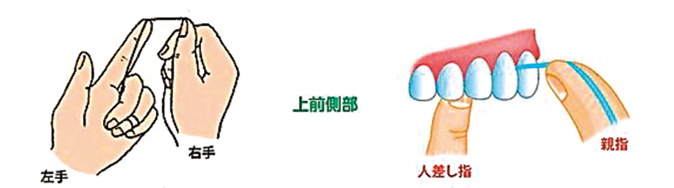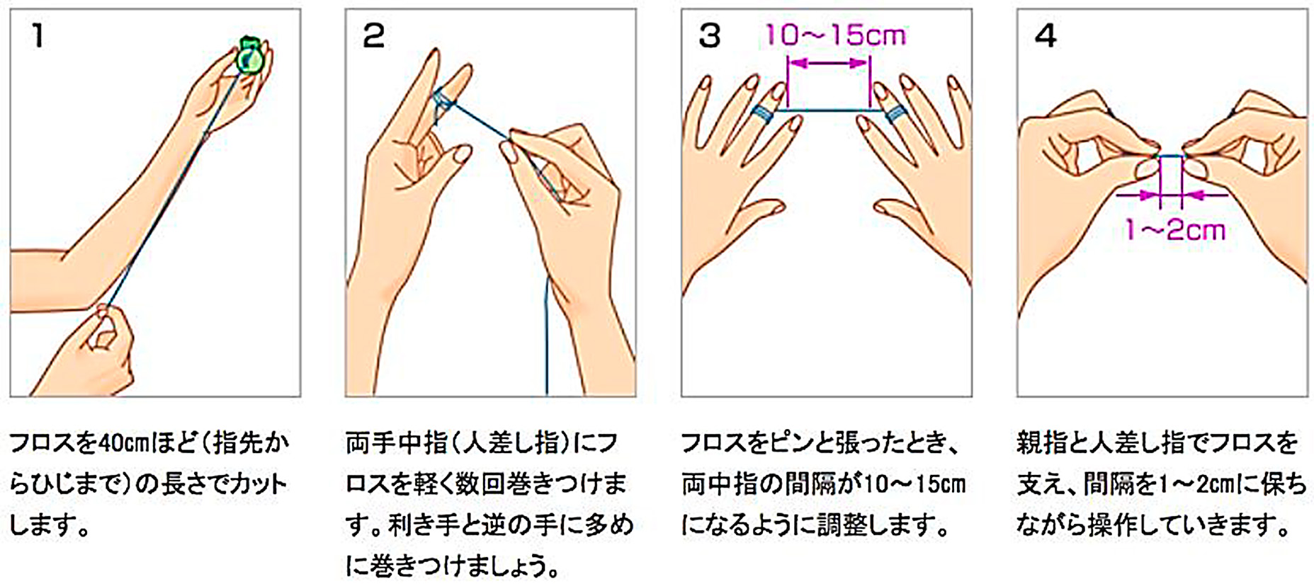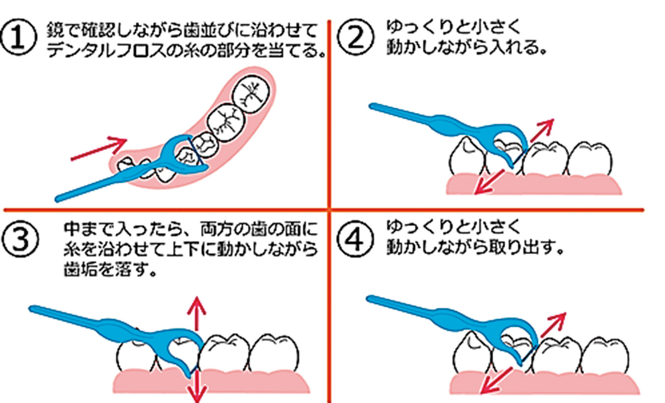 デンタルフロスの使用は、初めは難しく感じる方もいらっしゃると思いますが、まずは前歯など見えやすく操作しやすい部位から行ってみて下さい。